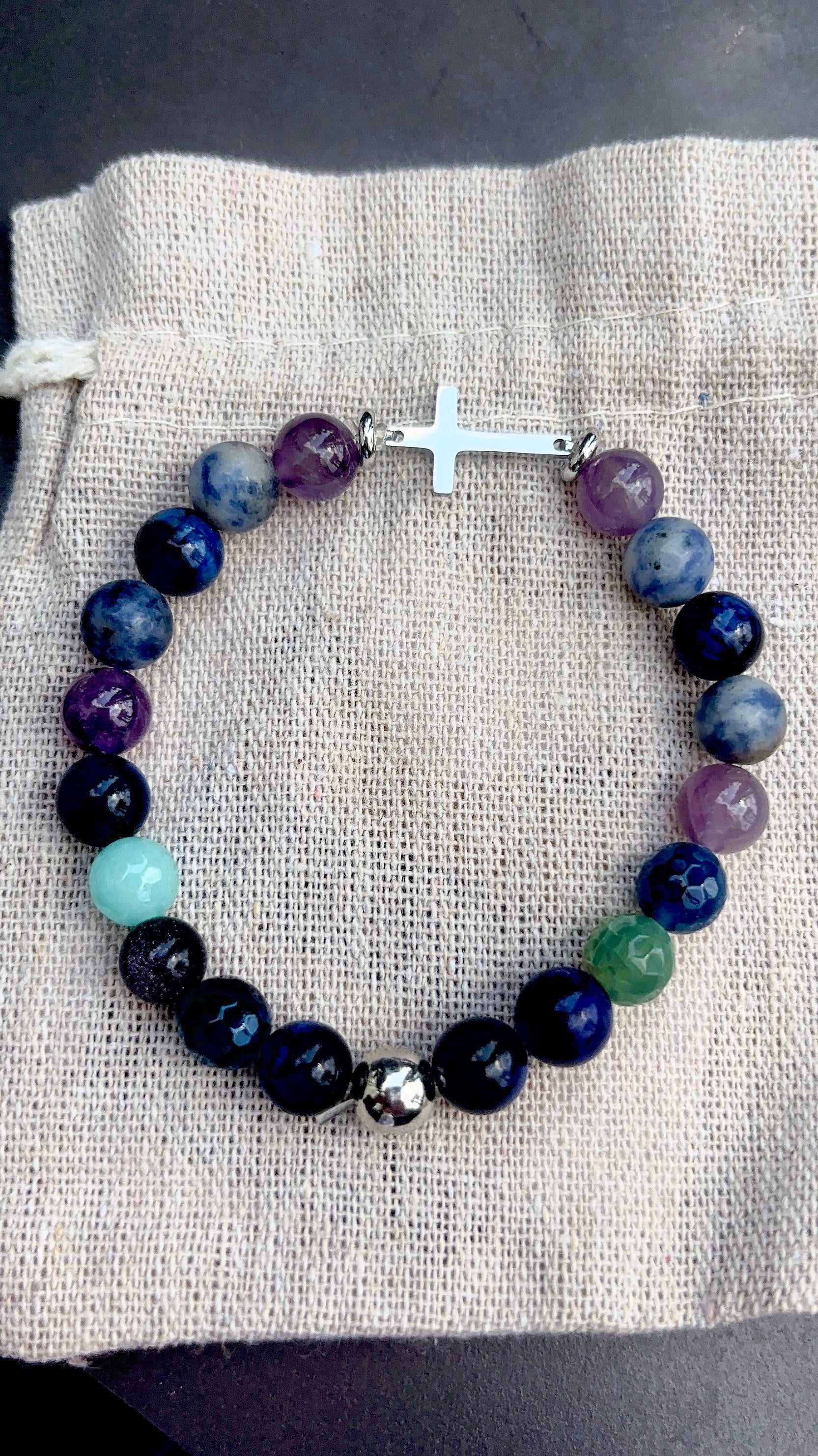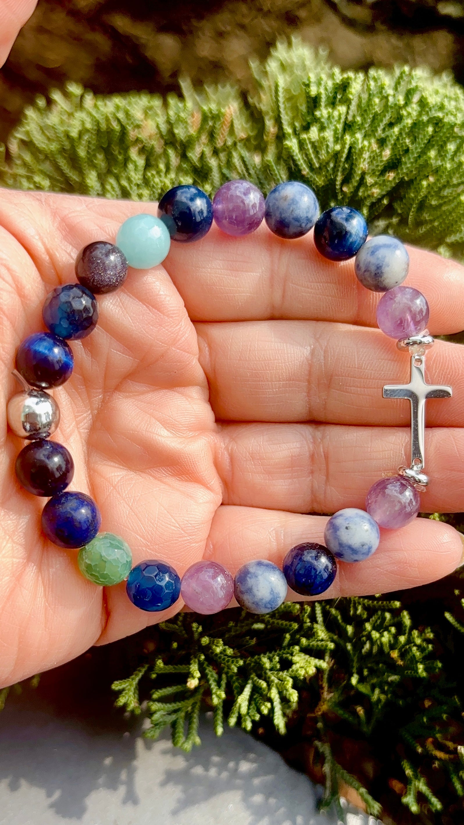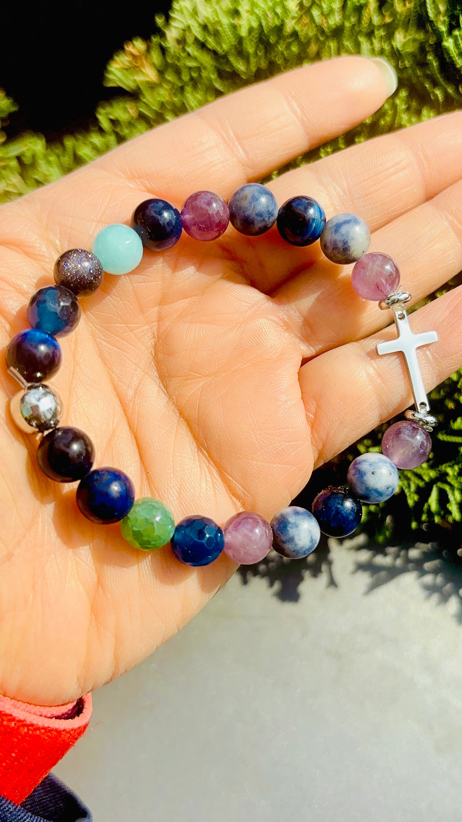 Conformada por una armoniosa mezcla de piedras naturales —amatista, ojo de tigre, turquesa, aventurina y jaspeadas tipo mar— esta pulsera canaliza energías de protección, sanación, claridad y abundancia. Cada piedra representa una fuerza distinta de la tierra y el alma.