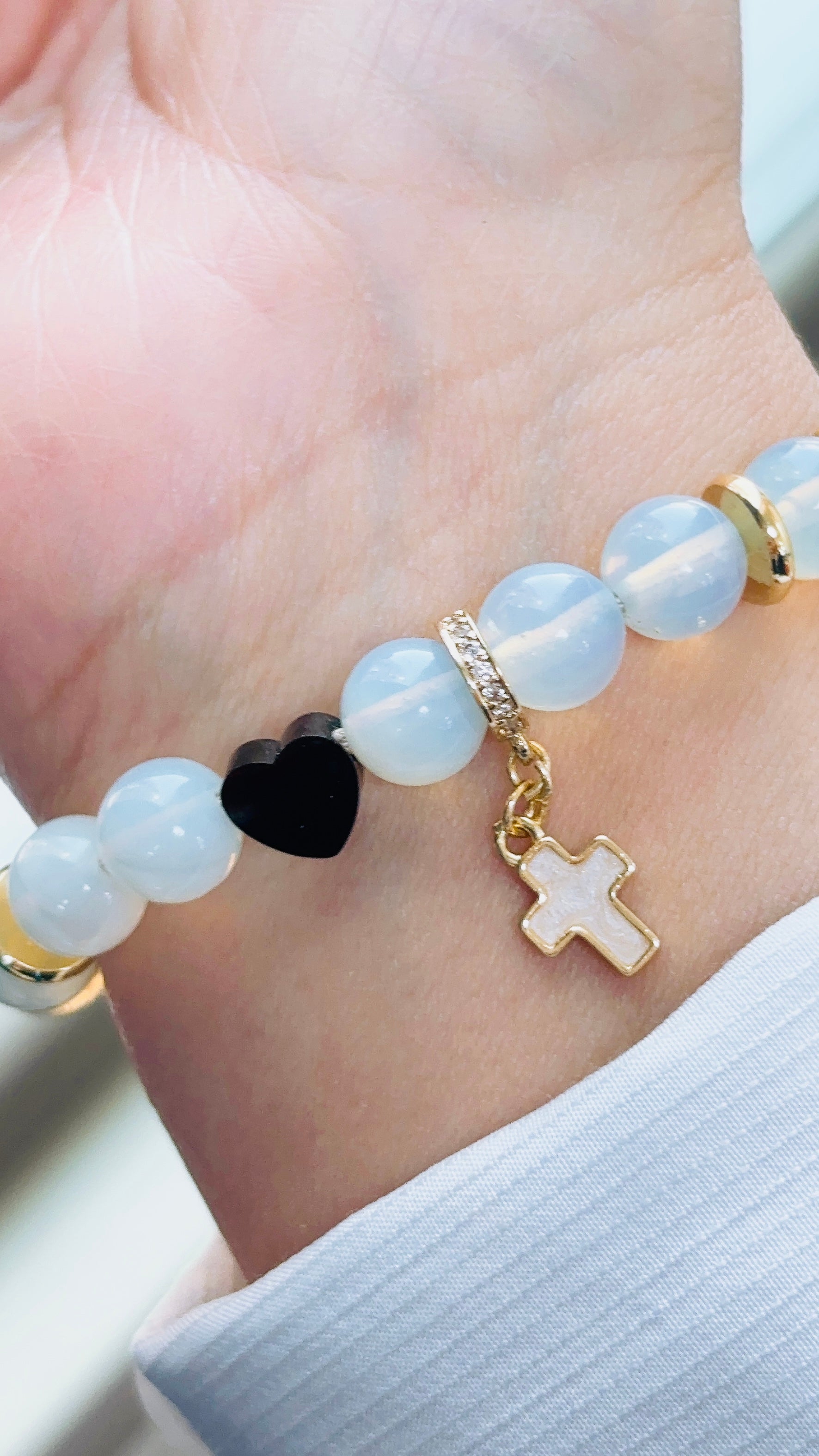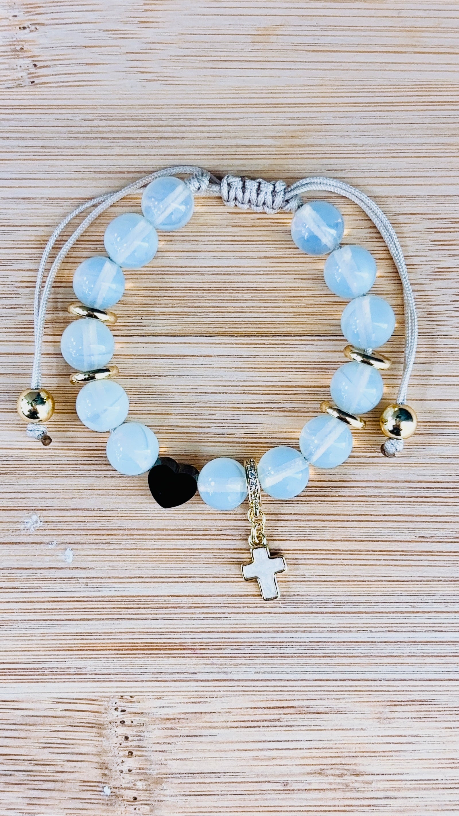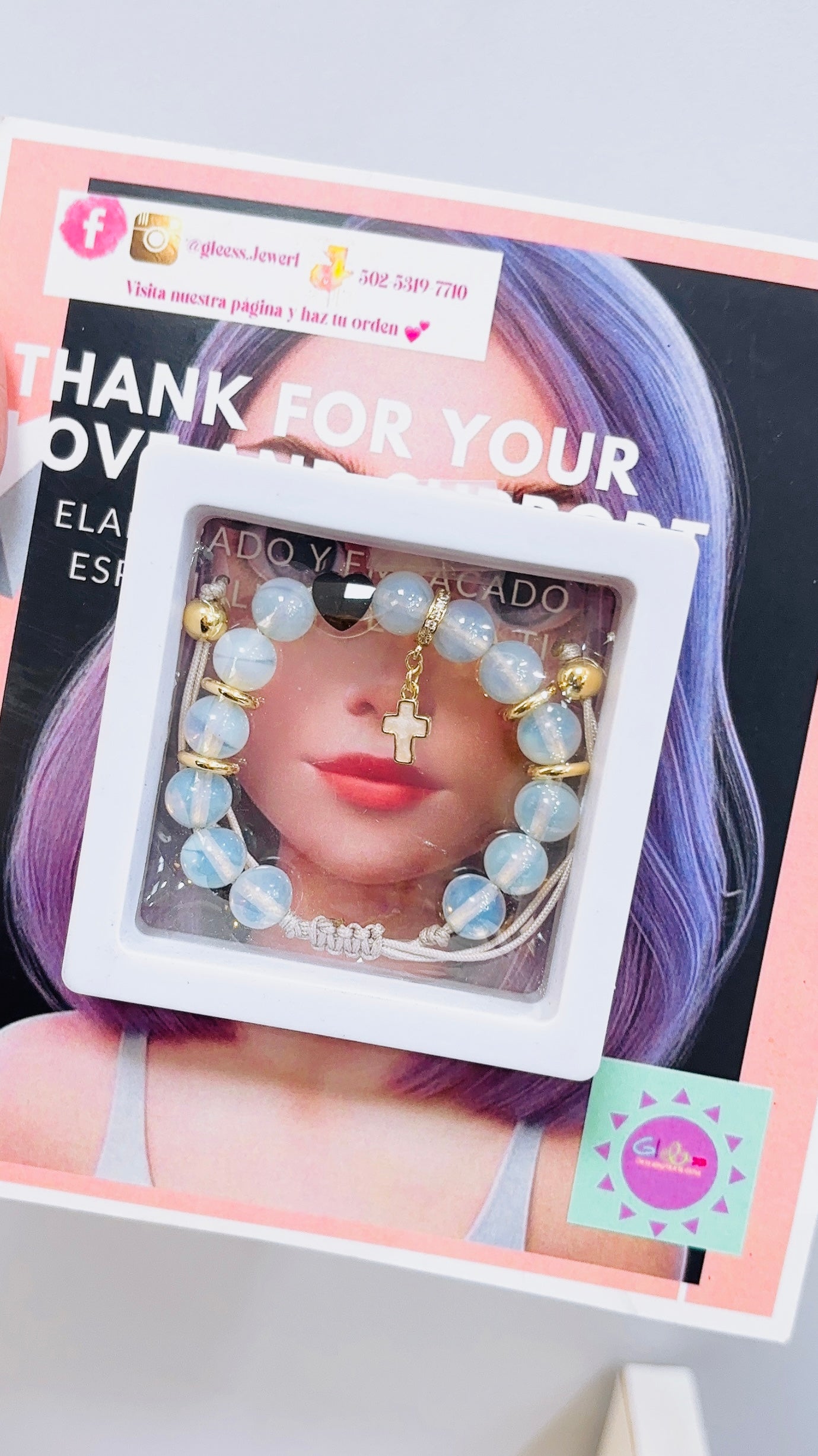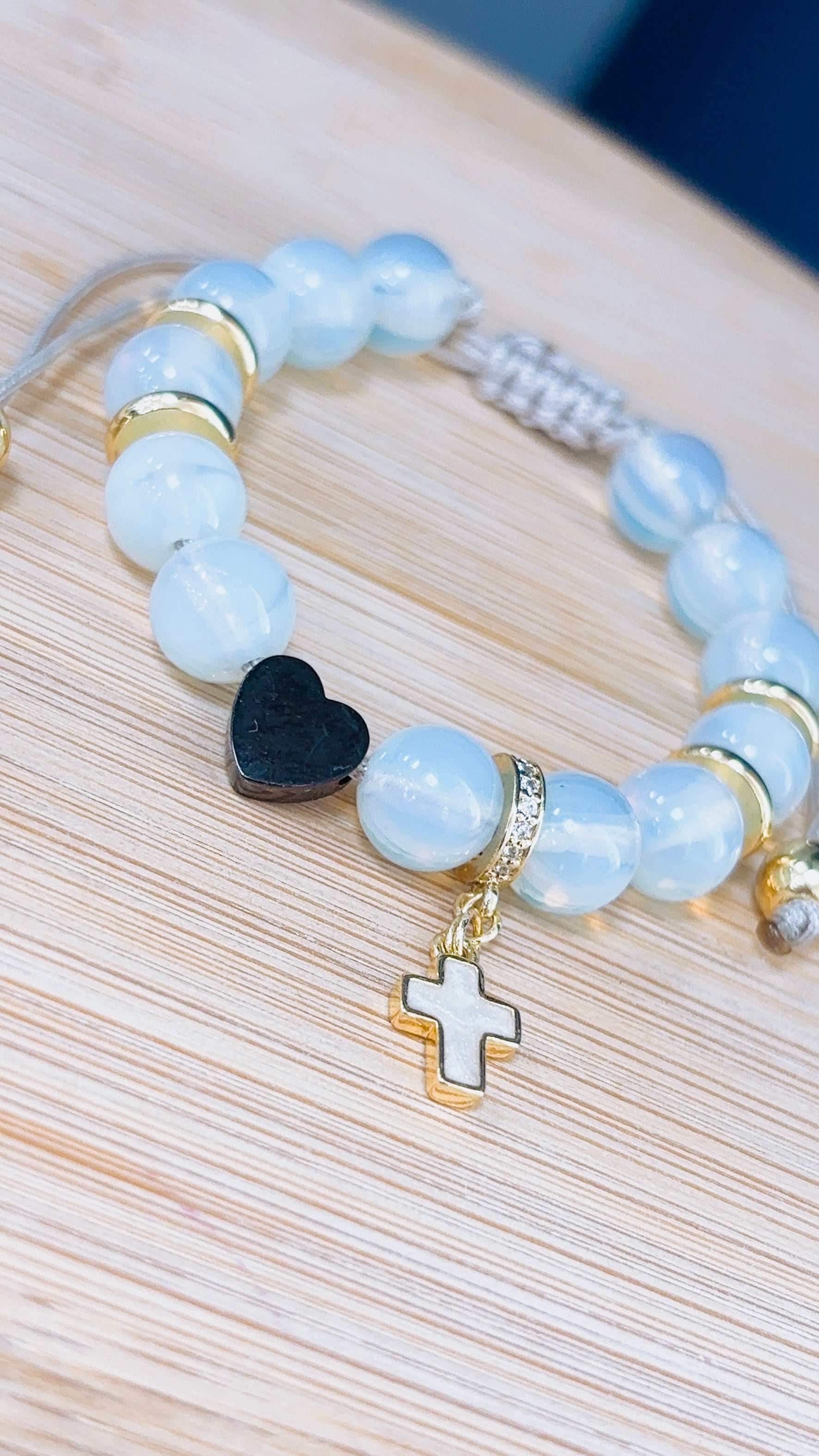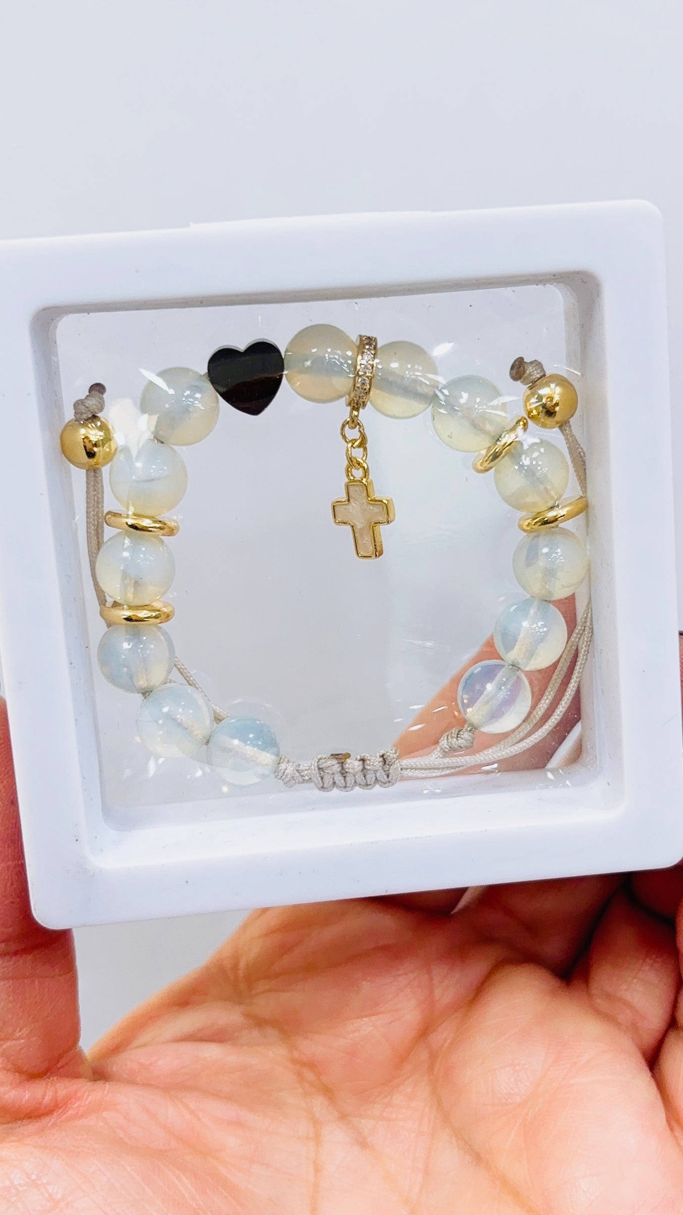 Luz Serena es un brazalete que combina la delicadeza de la piedra luna con el poder de la fe y la protección.