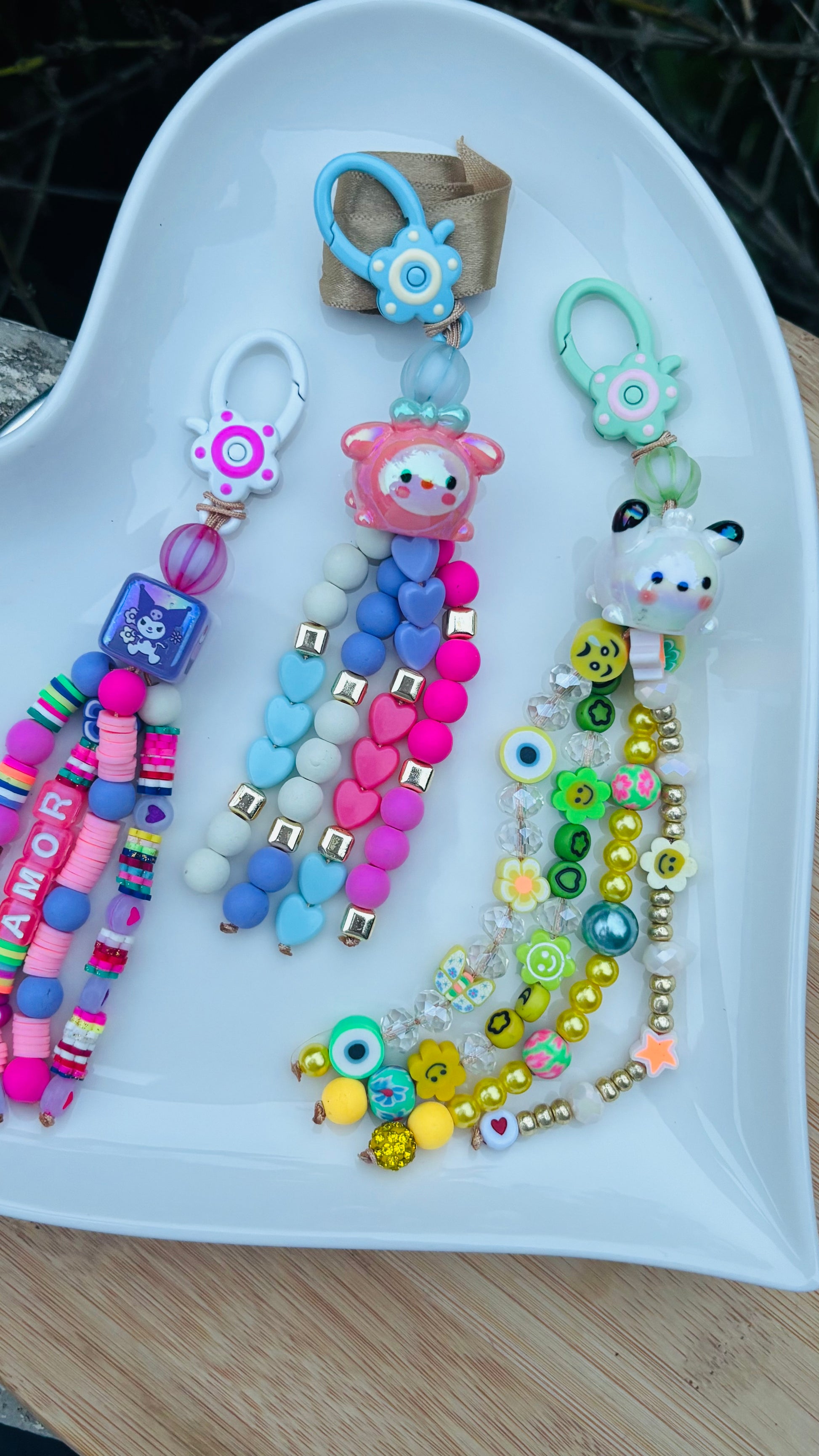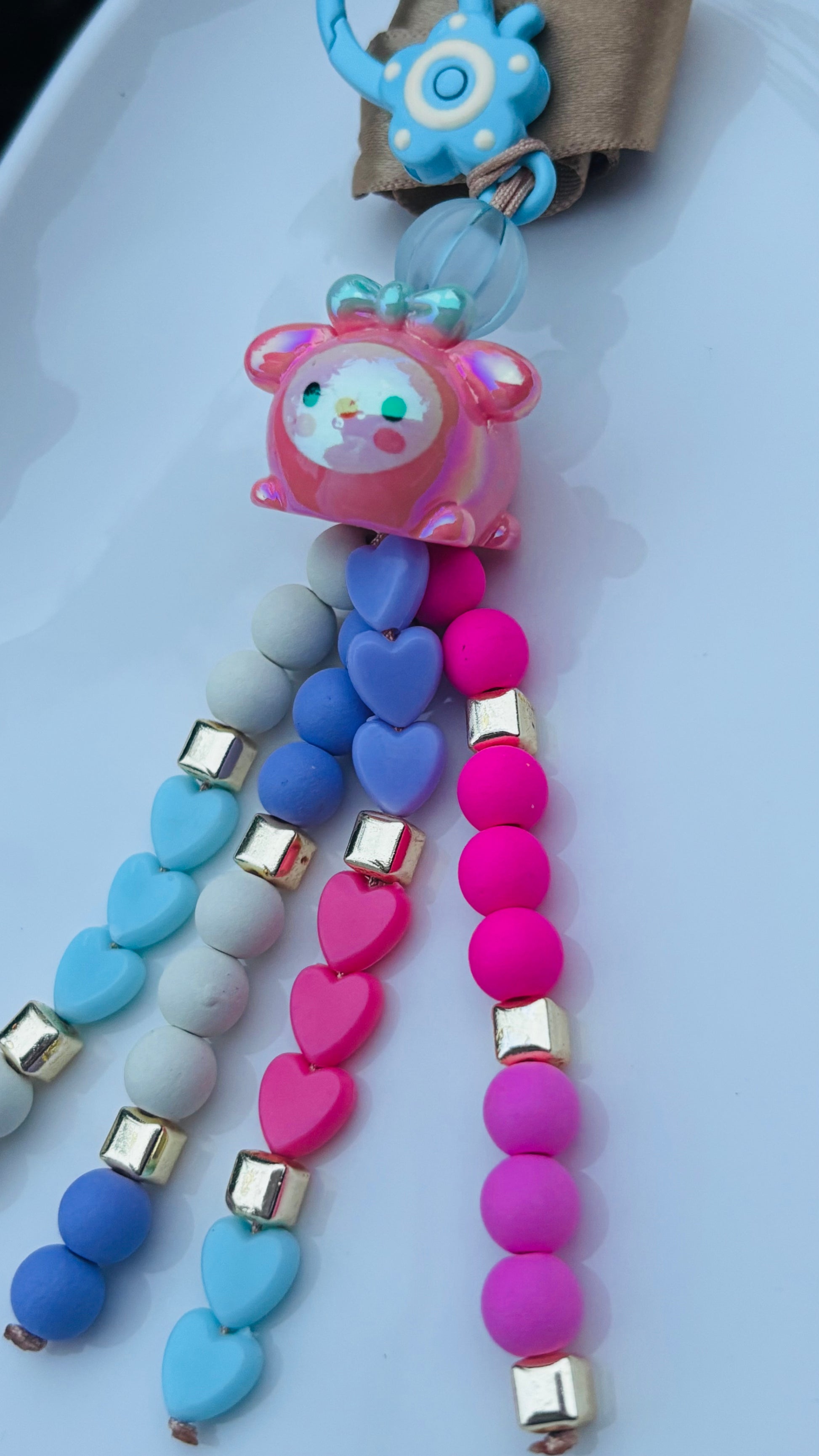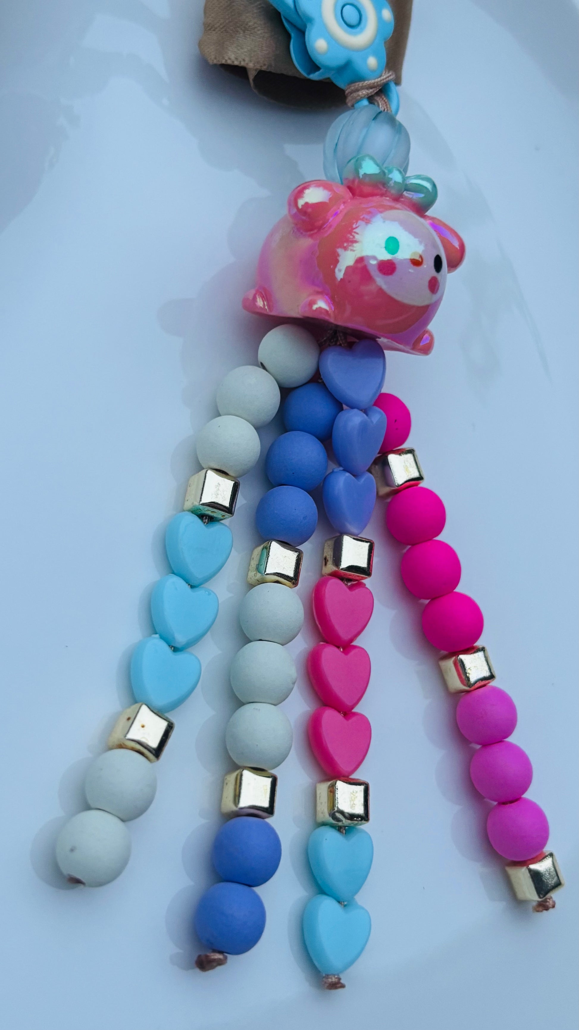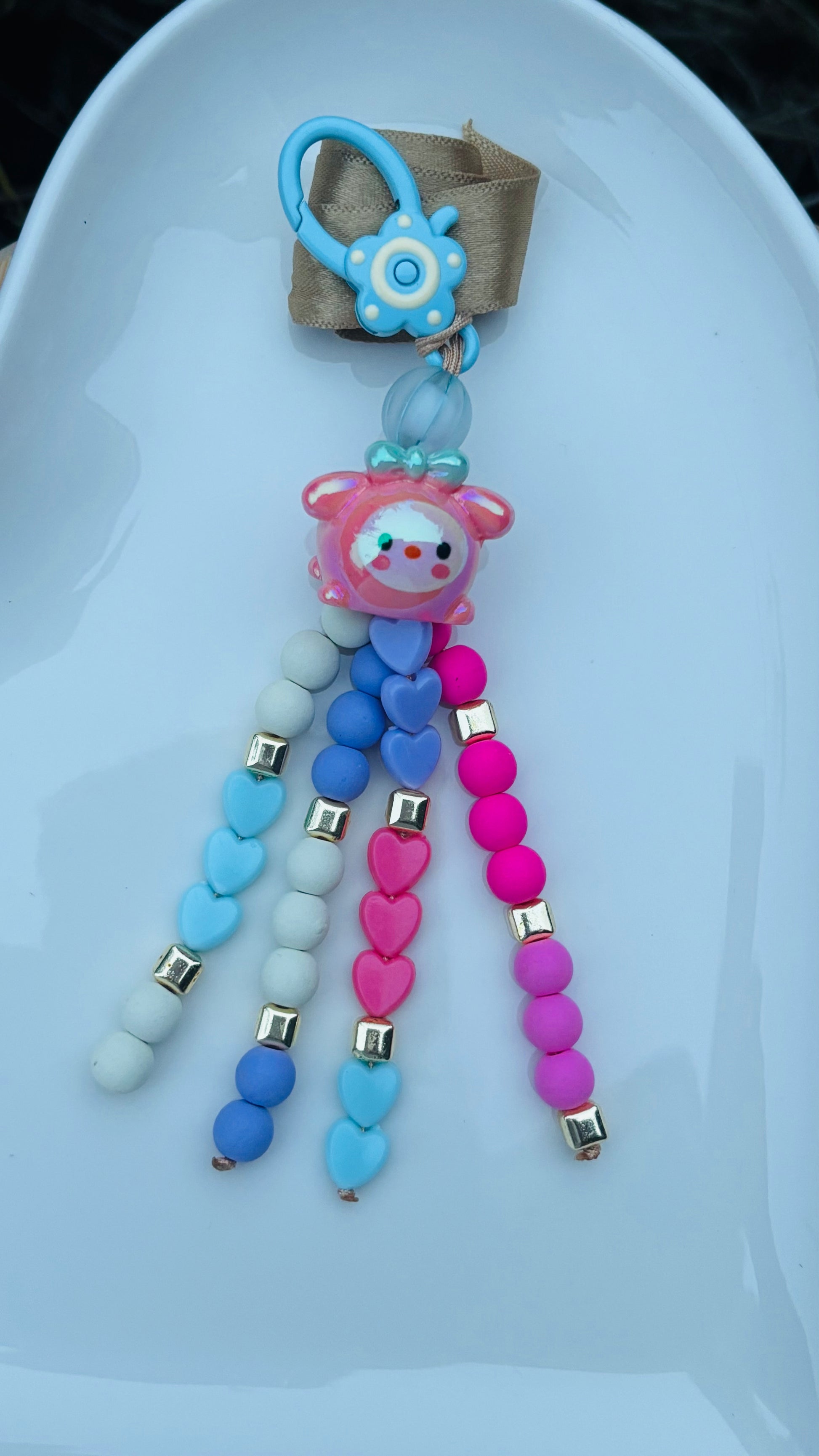 Un llavero delicado y encantador, con un osito rosa adorable al centro y tonos pastel que transmiten ternura. Las cuentas en forma de corazón le dan un toque de dulzura.